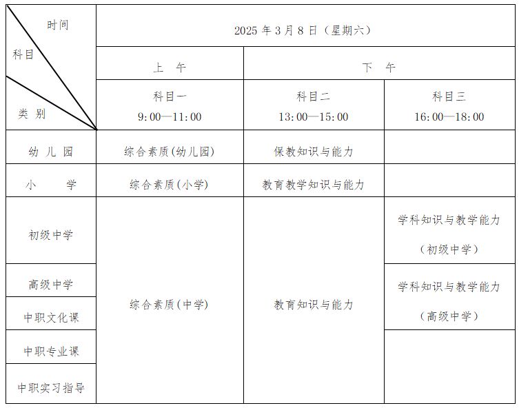 2025年上半年山东省教师资格考试的具体时间及科目安排,通常由山东省教育厅或山东省教育招生考试院发布。以下是一般的时间安排和科目设置,但请注意,具体日期可能会有变动,请以官方发布的最新信息为准。