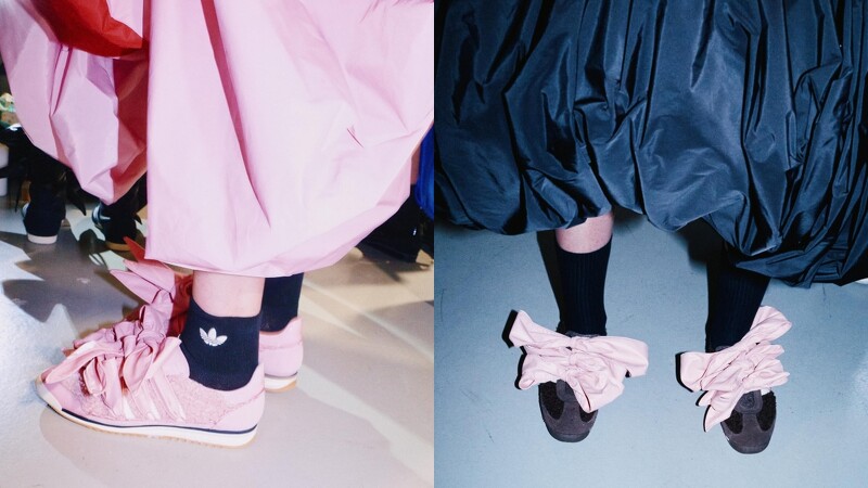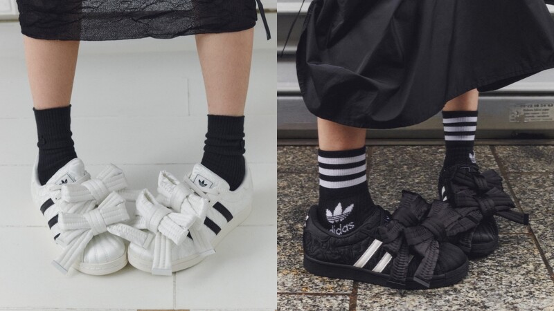 秀上还能看到爱迪达经典的Superstar鞋款也在其中,透过模特穿着的款式来看,鞋身改为Caroline Hú偏爱的缎面材质,并保留了标誌性的贝壳鞋头设计,而鞋身上搭配的则是夹棉横缝的蝴蝶结饰带,让鞋款看来既有蓬鬆感又俐落。