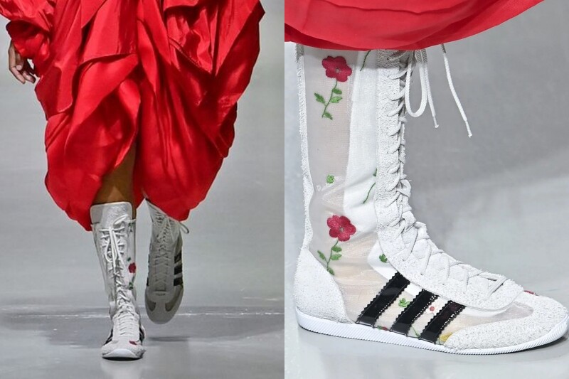 最后一款联名则是难以忽视的高筒鞋款,来自爱迪达的Japan VH高筒运动鞋,高达17孔设计的鞋身,搭配上网纱拼接与花卉刺绣,鞋身上的三线标誌以黑色漆皮呈现,工艺感十足。